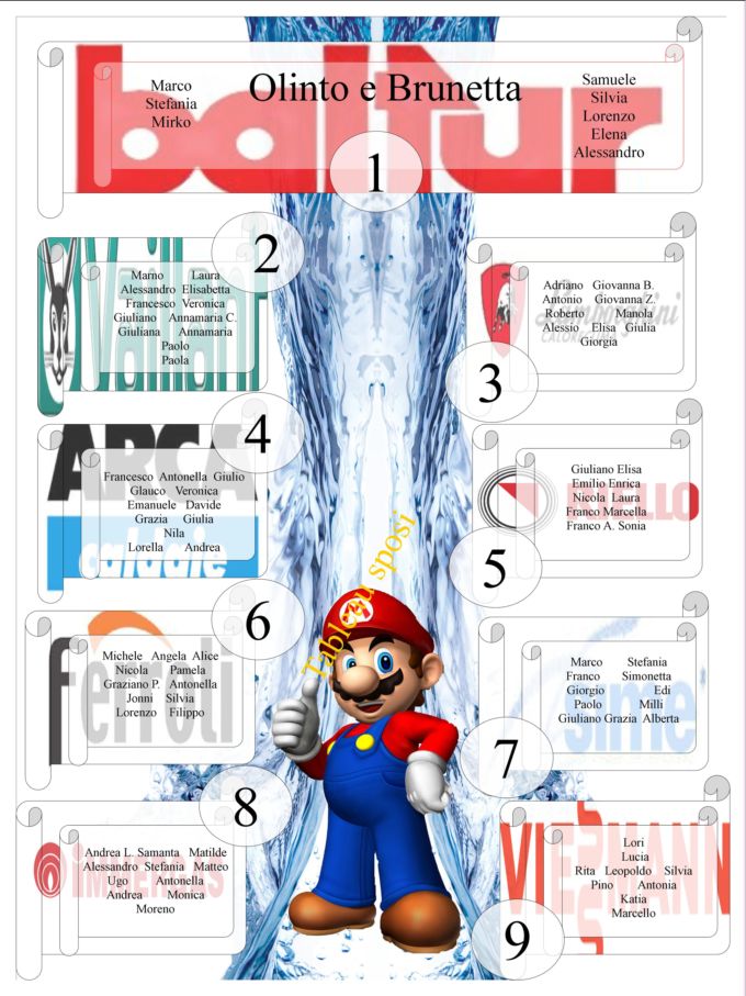 Utilizzando la marca di 9 caldaie differenti ho inserito la scritta in sottofondo e applicato i nomi in sovra impressione compreso il tavolino degli sposi